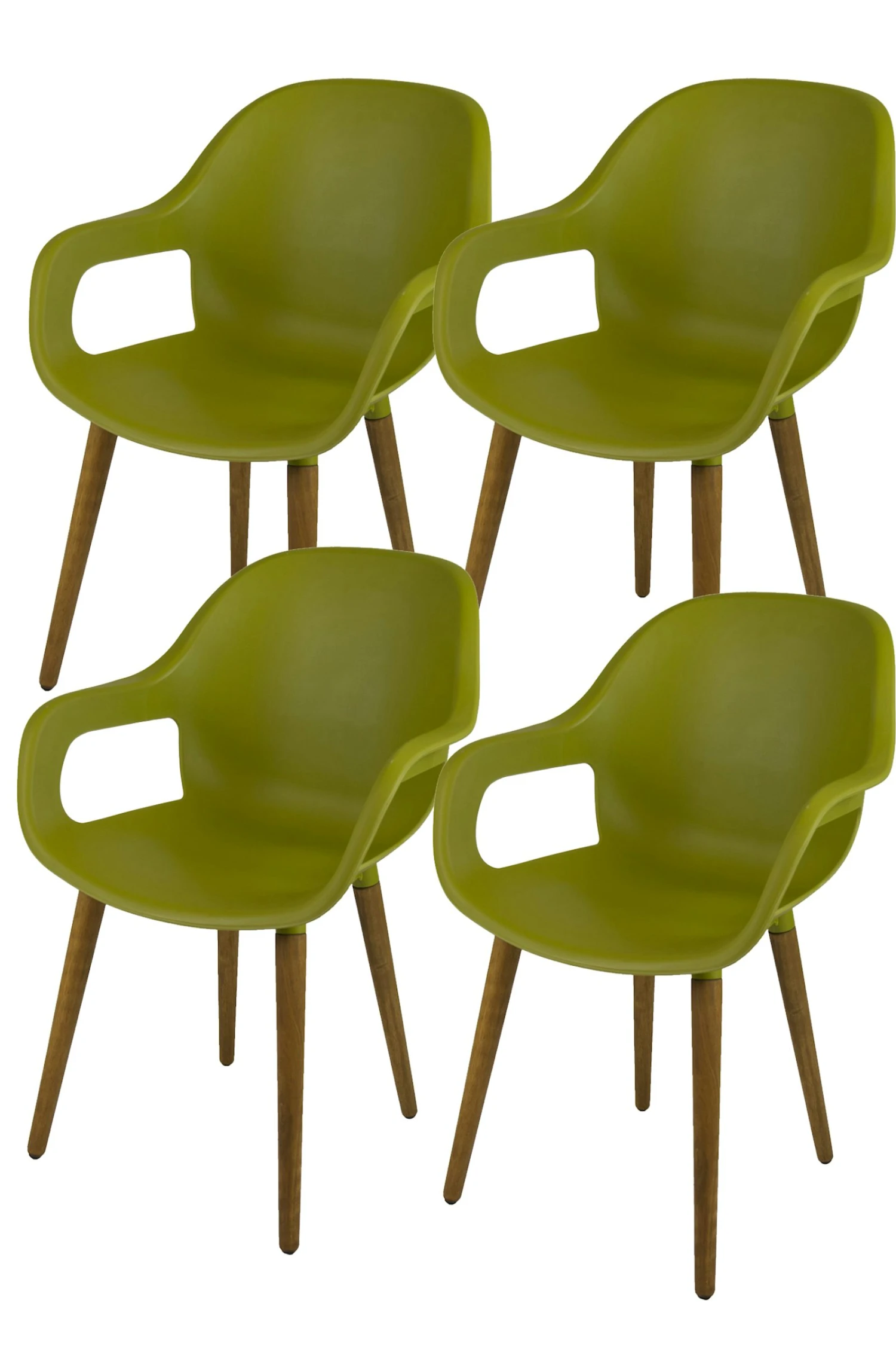 De dining stoel heeft een kunststofschalen kuip in de kleur olijf groen. De poten zijn gemaakt van acacia hardhout. Deze stoel past bij vele stijlen en soorten tafels. De stoelen zitten per 4 stuks verpakt en zijn makkelijk in elkaar te zetten.