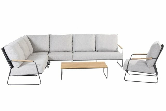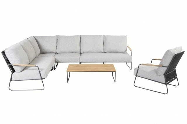 De Balade loungeserie is minimalistisch vormgegeven. De ranke rvs frames gepoedercoat in de kleur antraciet en de prachtige afwerking met weersbestendig cord in de rugleuning geven de Balade loungeset een industriële en eigentijdse uitstraling aan uw terras. Het frame is elegant vormgegeven en heeft op de armleuning warme teakaccenten. De Balade loungeserie bestaat uit een modulaire hoekopstelling en een losse opstelling.