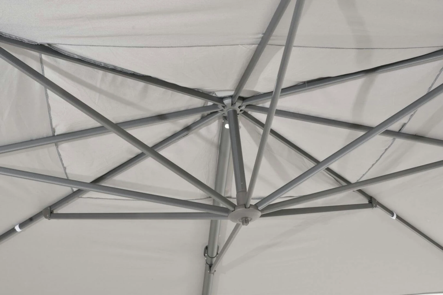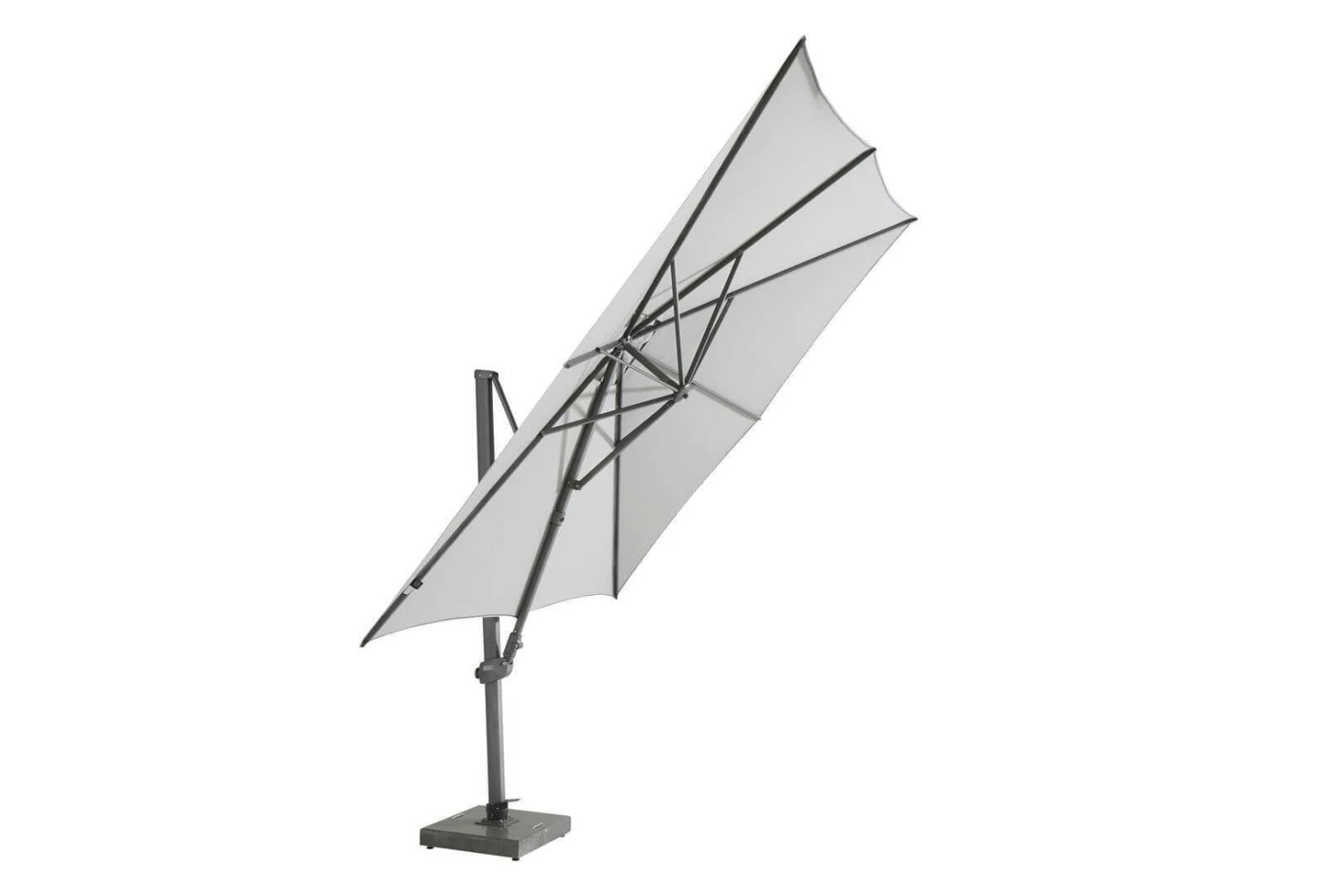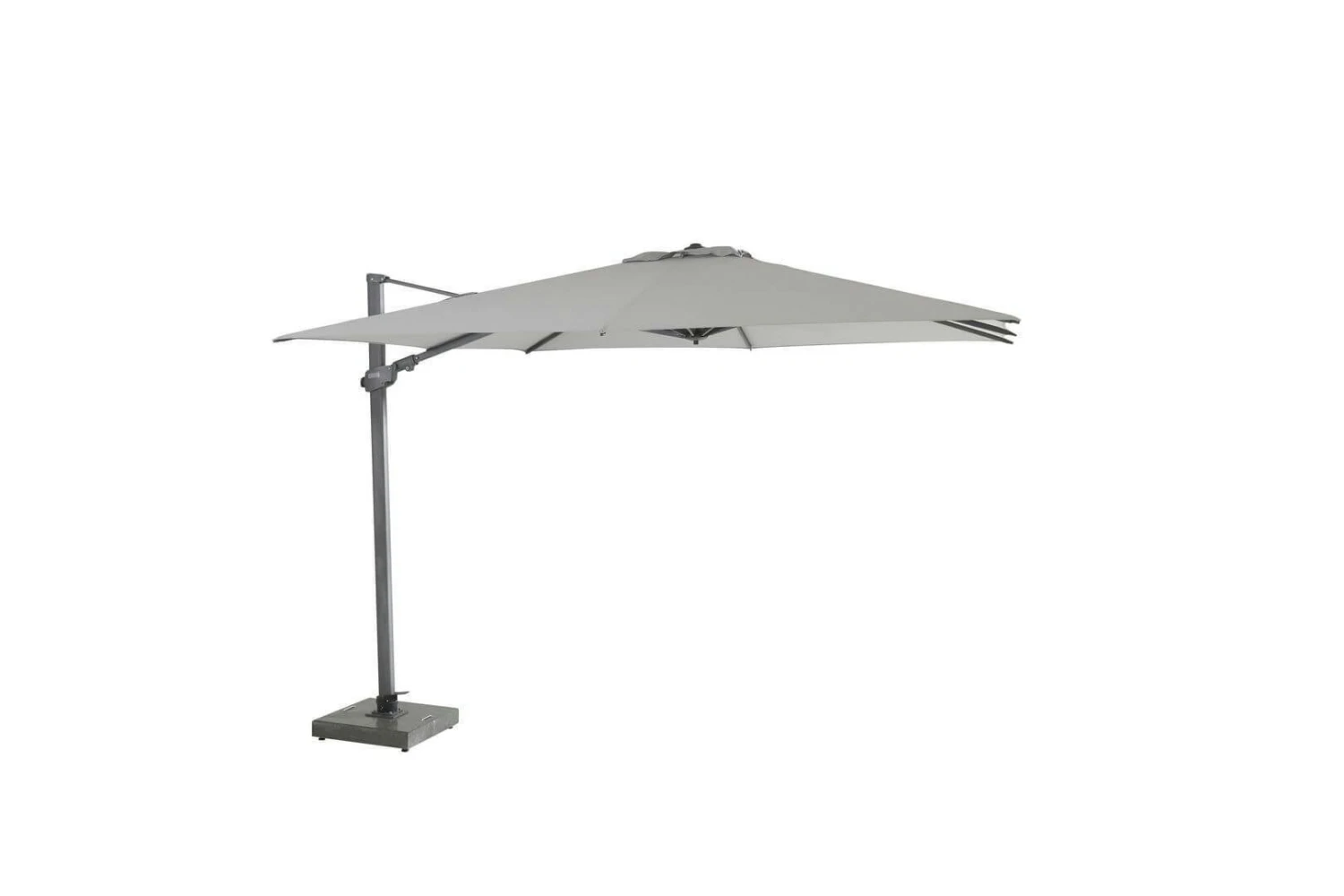 Onze Siesta parasol met extra kantelbare functie: Siesta Premium. Deze veelzijdige zweefparasol heeft een degelijk frame van aluminium, verkrijgbaar in Antraciet of Witte poedercoating. Er zijn diverse functionaliteiten om op uw terras met het grootste gemak schaduw te verzorgen op de gewenste plek. De vrij hangende parasol is makkelijk draaibaar op zijn parasolvoet door een pedaal. Met een eenvoudige draaiknop kunt u de parasol richting het frame kantelen. Door met de hendel te draaien kunt u deze parasol ook nog beide kanten uit zwenken. In een extra ingang is met de hendel de parasol uit -en in te klappen tot een compact pakket. Behalve deze vernuftige functies gebruiken we hoogwaardige, weerbestendige materialen. Het Olefin parasol doek is bestand tegen een regenbui en blijft lang mooi van kleur. Plaats uw parasol op een van onze granieten voeten of kies voor een grondanker: de Siesta Premium parasol zorgt voor jarenlang tuin plezier op uw terras. De vrij hangende parasol is verkrijgbaar met een Charcoal / Taupe / Mid Grey gekleurd parasol doek.