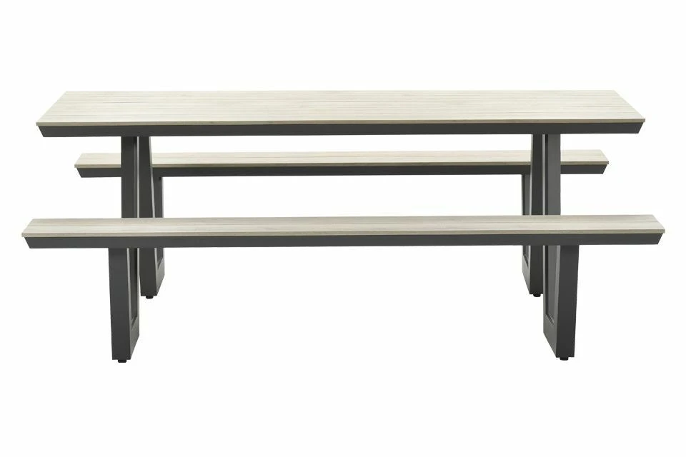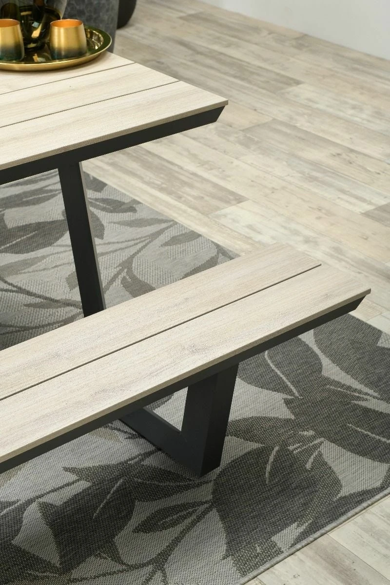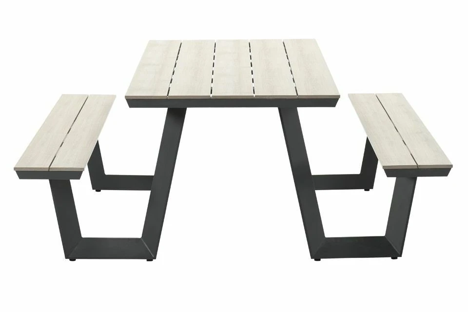 Deze picknicktafel is vervaardigd uit aluminium welke voorzien is van een hoogwaardige kwaliteit poedercoating. Het is een compacte picknickset en is daarmee ook ideaal voor kleinere tuinoppervlaktes. Het tafelblad en de zittingen zijn voorzien van polywood planken met een teaklook. Polywood is een onderhoudsvriendelijke kunststof met een mooie houtuitstraling. Let wel op voor scherpe voorwerpen en vector vorming anders heb je zo krassen of smeltpuntjes in het polywood.