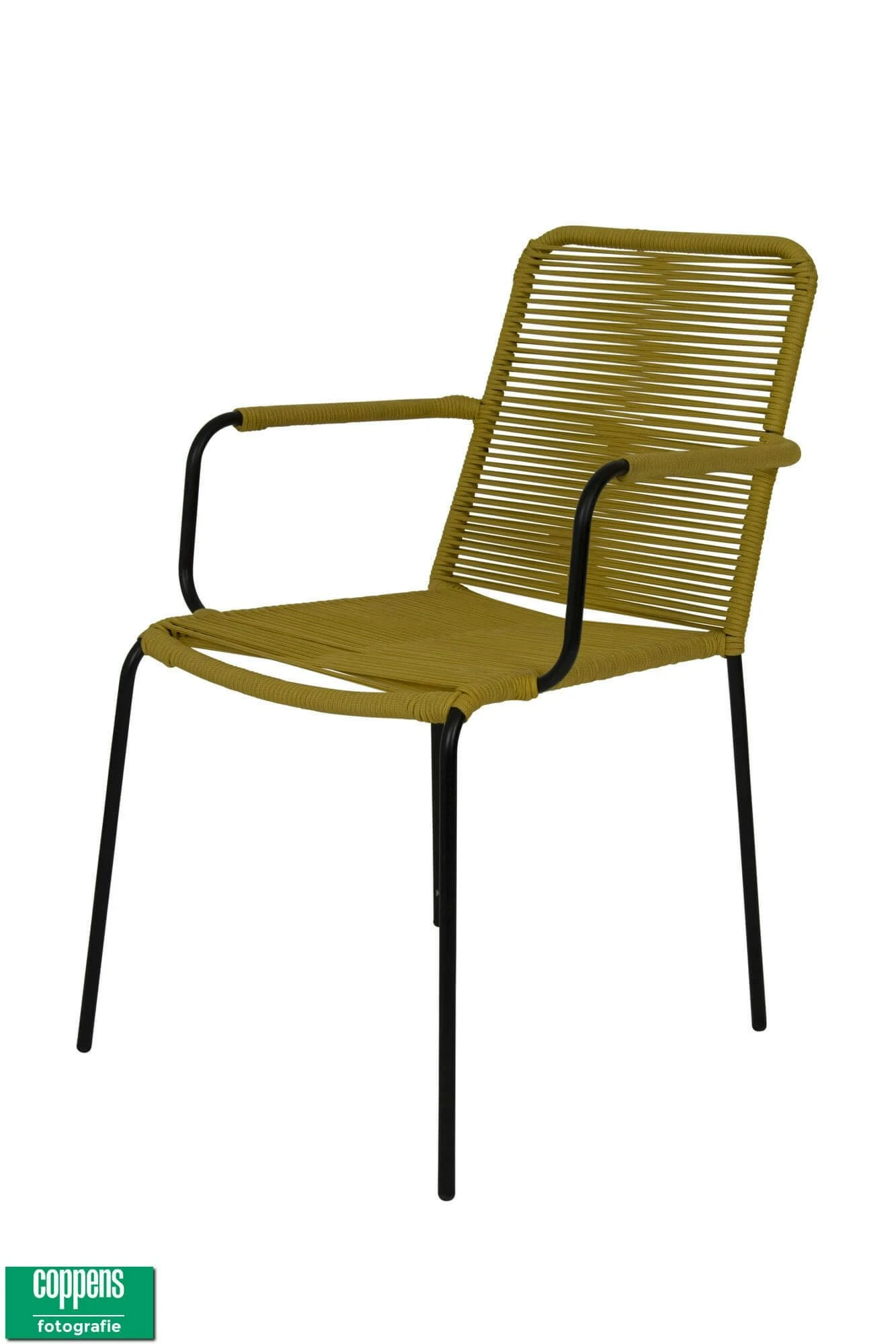 Deze mooie hippe dining stoel Denver met armleggers met Yellow rope (touw). Deze stoel is ook makkelijk op te bergen omdat hij stapelbaar is.