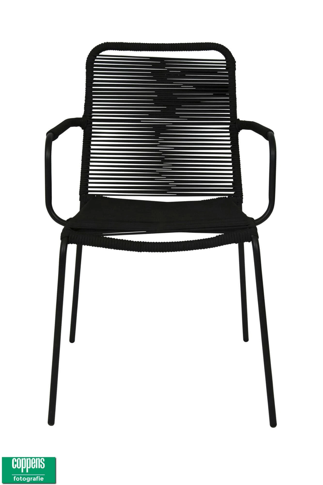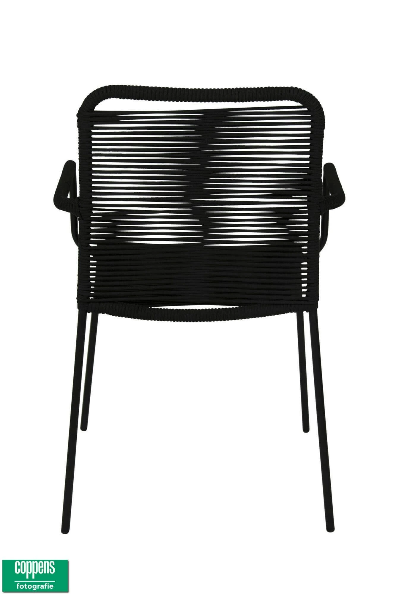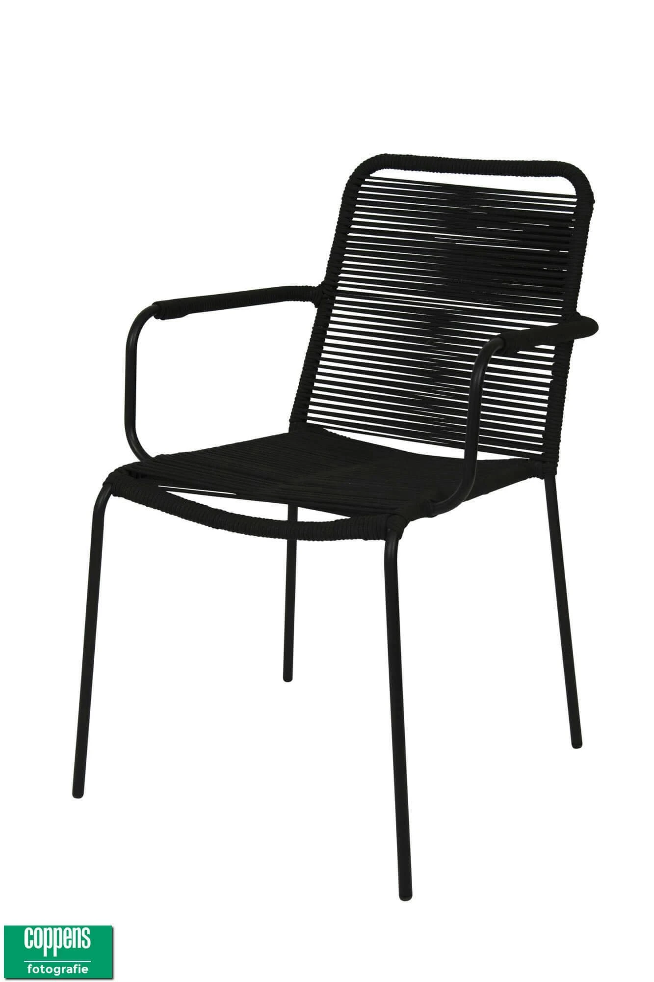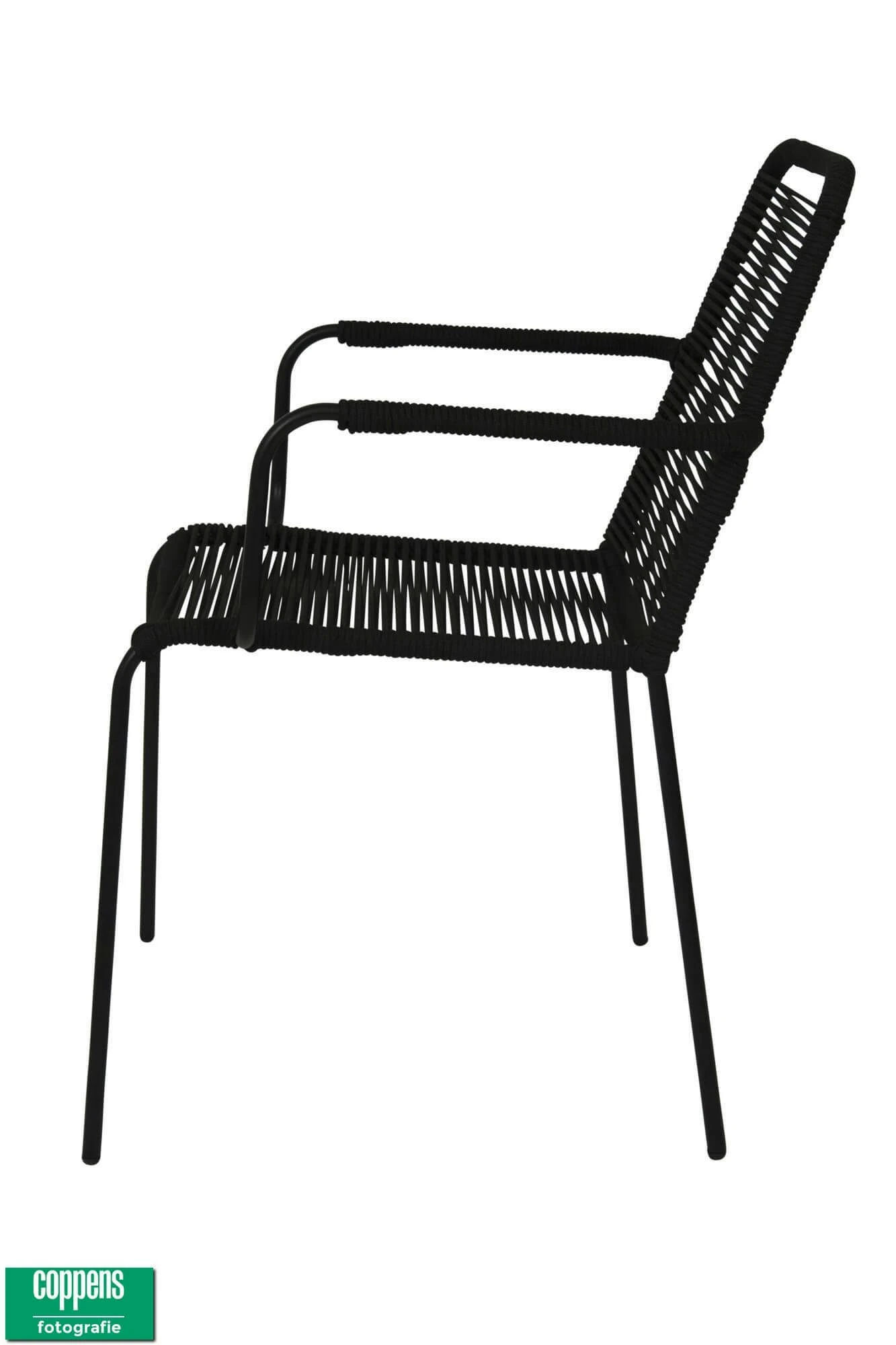 Deze mooie hippe dining stoel Denver met armleggers met Zwart rope (touw). Deze stoel is ook makkelijk op te bergen omdat hij stapelbaar is.