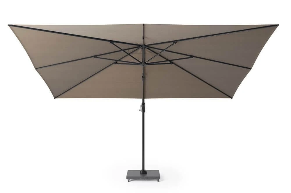 De parasol wordt geleverd exclusief parasolvoet en hoes. Het advies voor deze parasol is een voet van minimaal 120 kg. Om de levensduur te verlengen adviseren wij om een hoes te gebruiken als de parasol niet gebruikt wordt