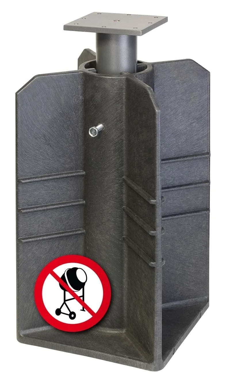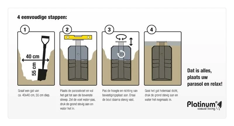 Deze uinieke ingraafbare parasolvoet kan gemakkelijk geplaatst worden in 5 stappen.