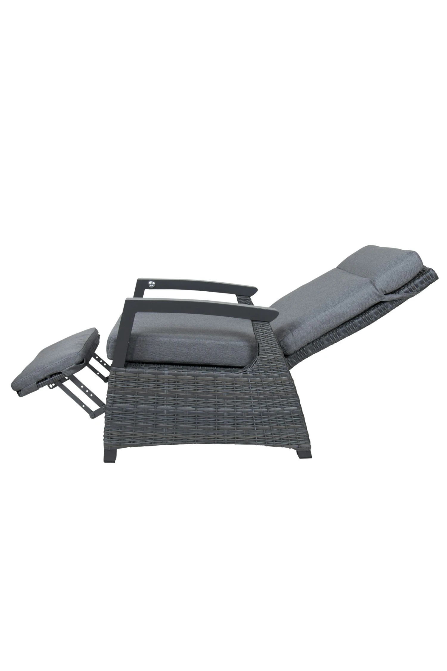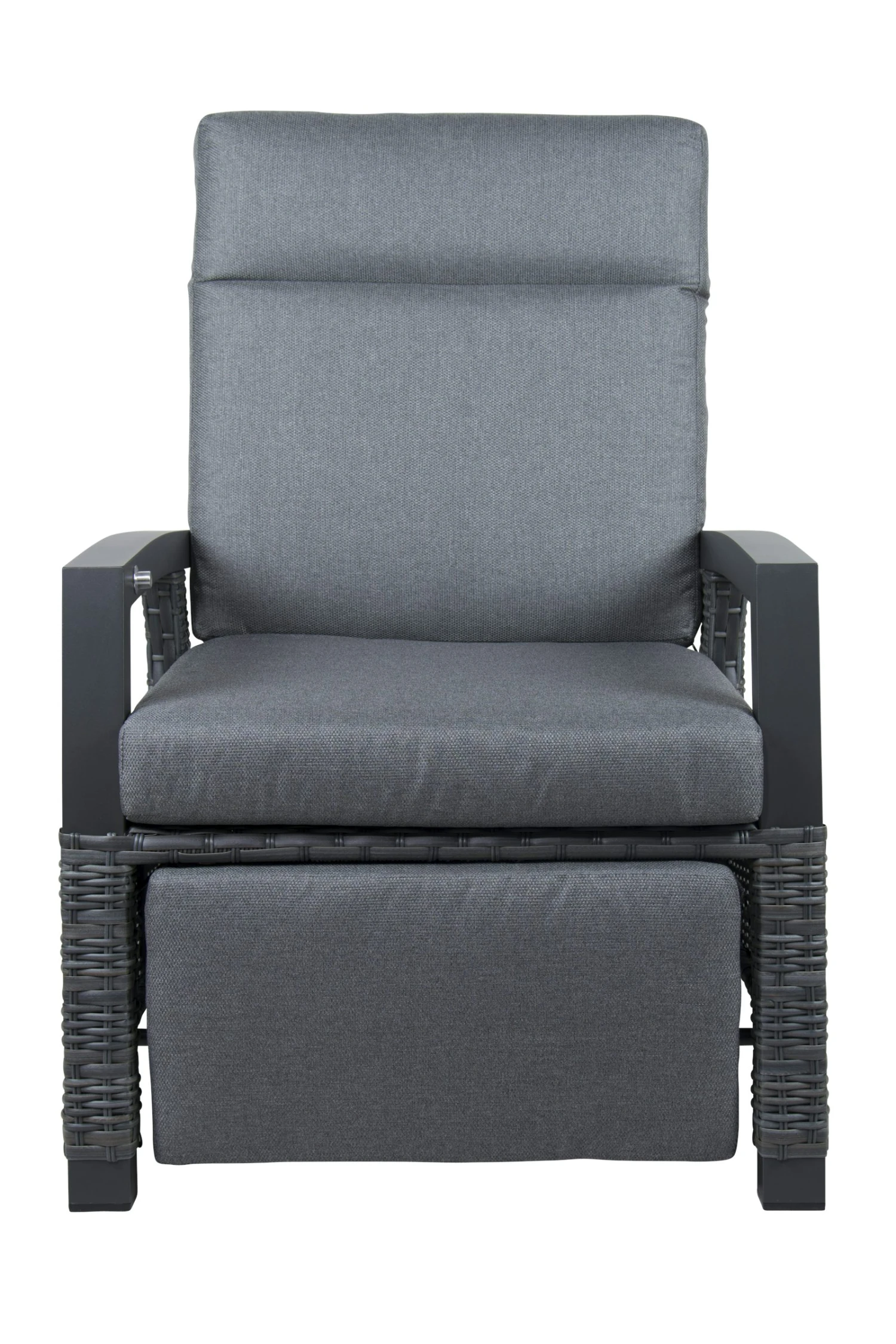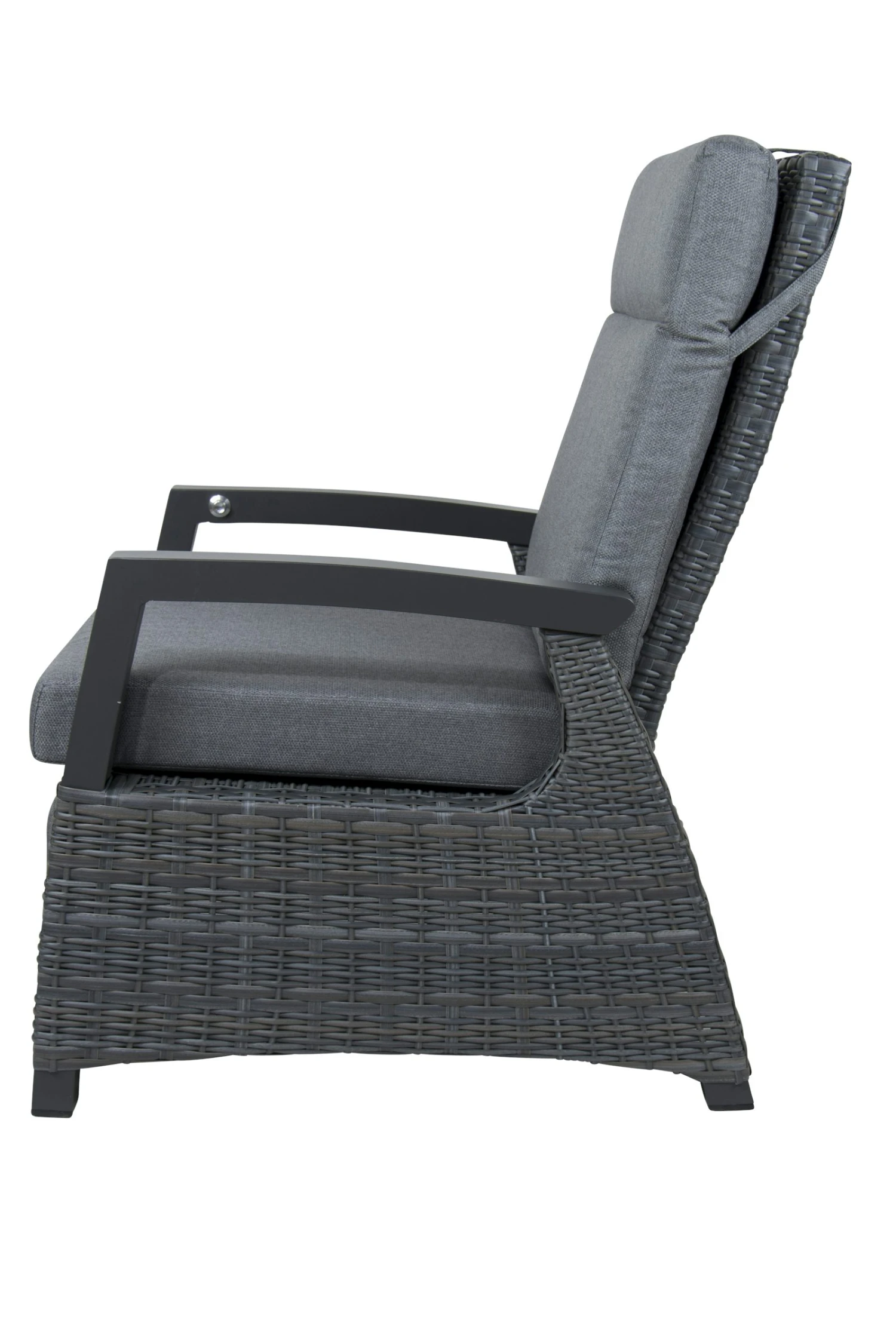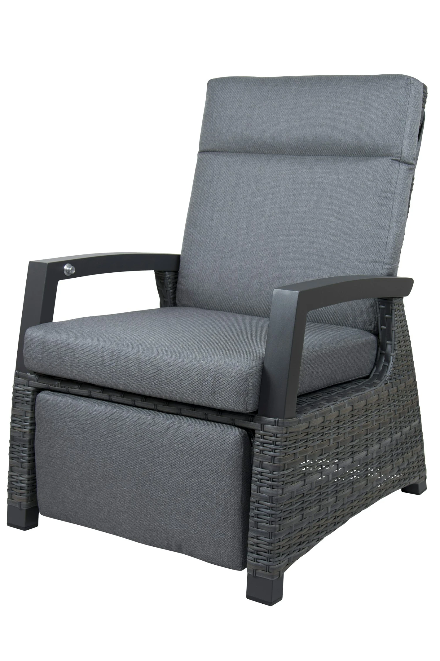 Deze loungestoel is traploos te verstellen in de rug door middel van een knop in de armleuning