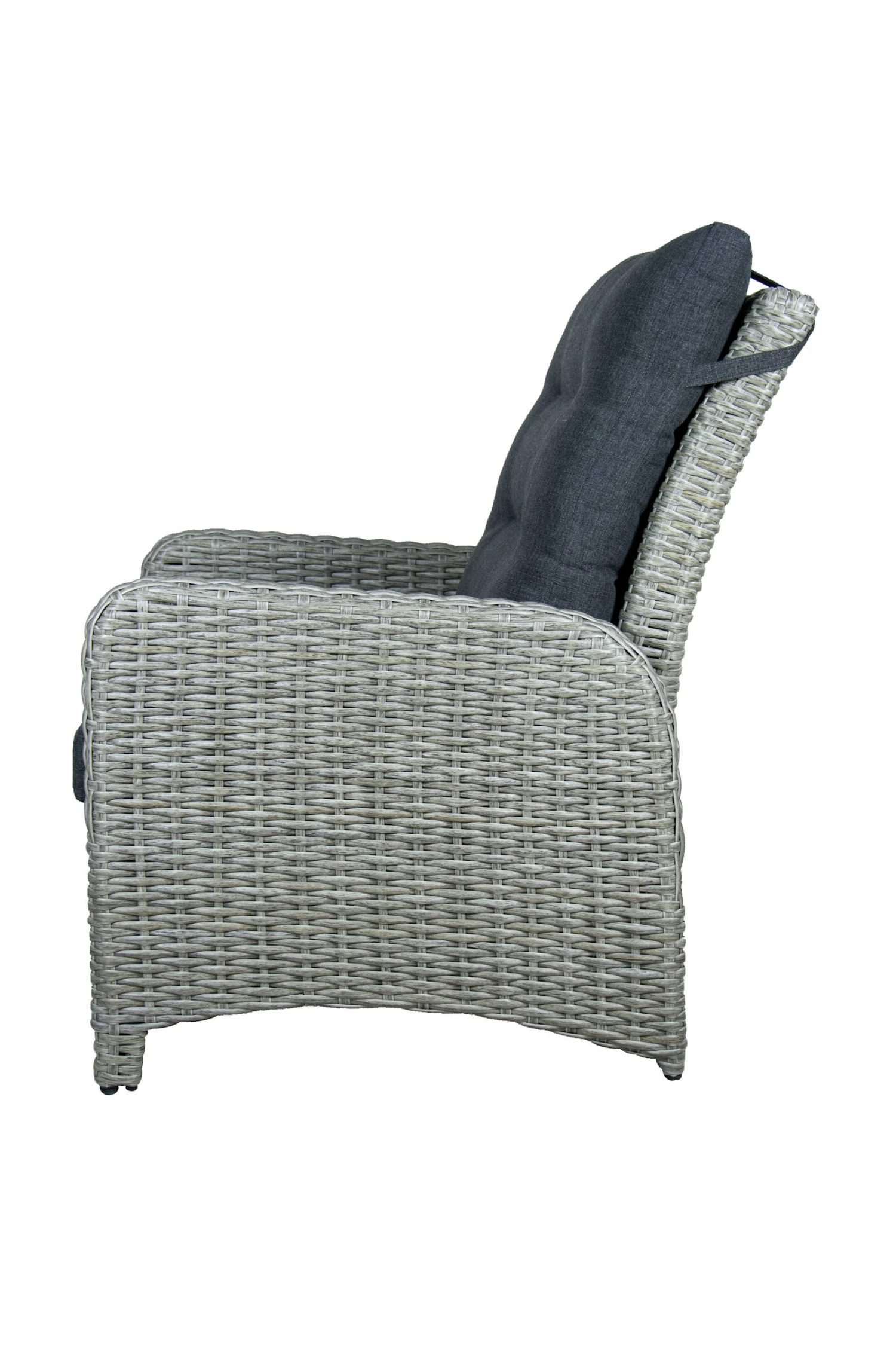 Deze royale stoel heeft een extra hoge rugleuning die traploos te verstellen is door middel van een gasveer. Het frame is gemaakt van onderhoudsvriendelijk aluminium.Het vlechtwerk is een luxe halfronde brede draad in de kleur lichtgrijs. Deze stoel is gemaakt om lekker te kunnen relaxen.
