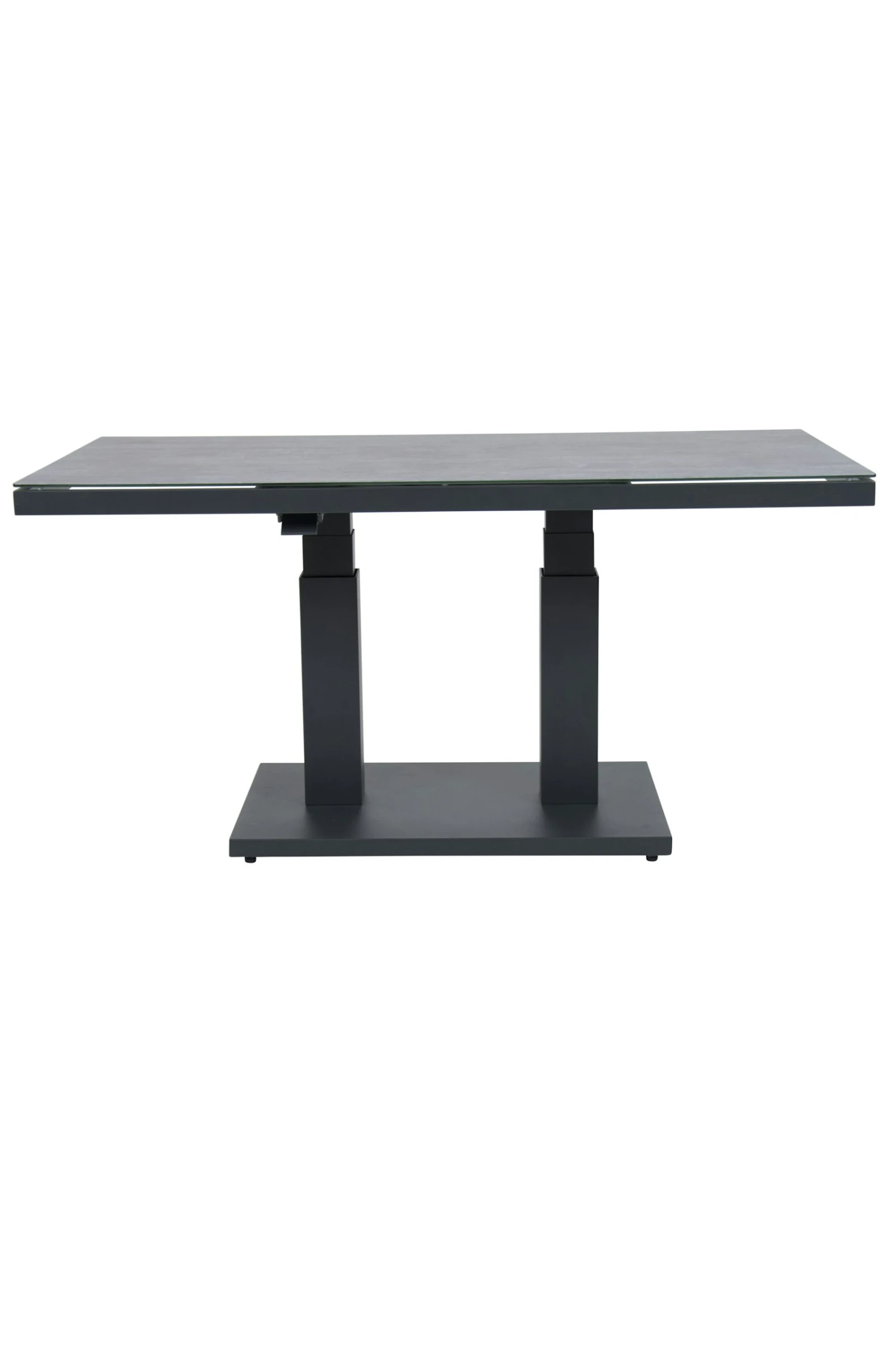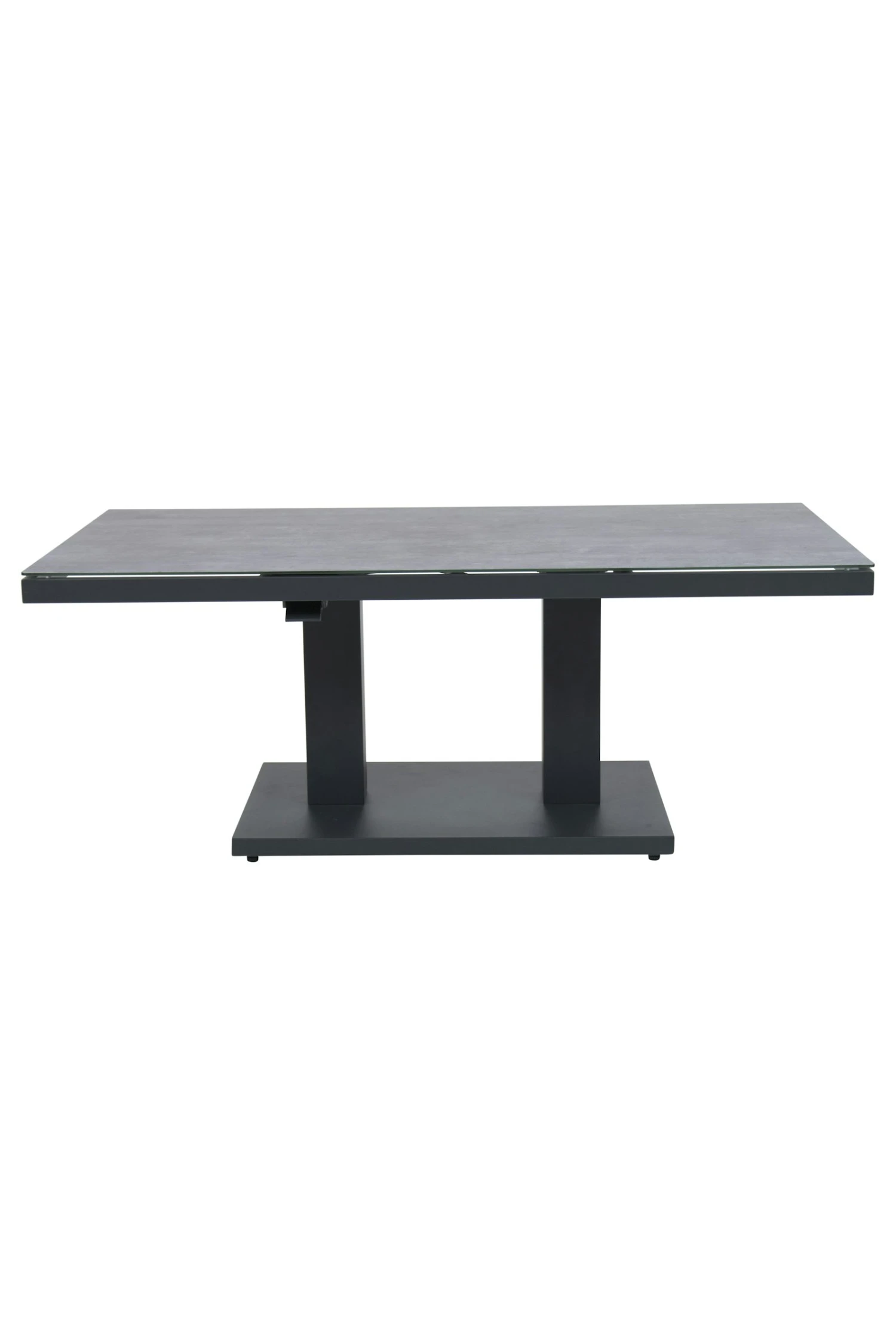 Deze unieke up-down tafel Rubli is de ideale tafel. De tafel is door middel van een gasveer te verstellen in een hoogte van 49 cm tot 72 cm hoog. Hiermee kunt u het als loungetafel en eettafel gebruiken. De tafel kunt u gemakkelijk verstellen door een hendel die onder het blad is gemonteerd. Door het mooie strakke aluminium onderstel past de tafel bij veel stijlen van bijvoorbeeld loungemeubels. Het frame is gepoedercoat in de kleur mat antraciet en het blad is gemaakt van 6 mm veiligheidsglas. Op het blad zit een printing wat het blad een natuurlijk look geeft.