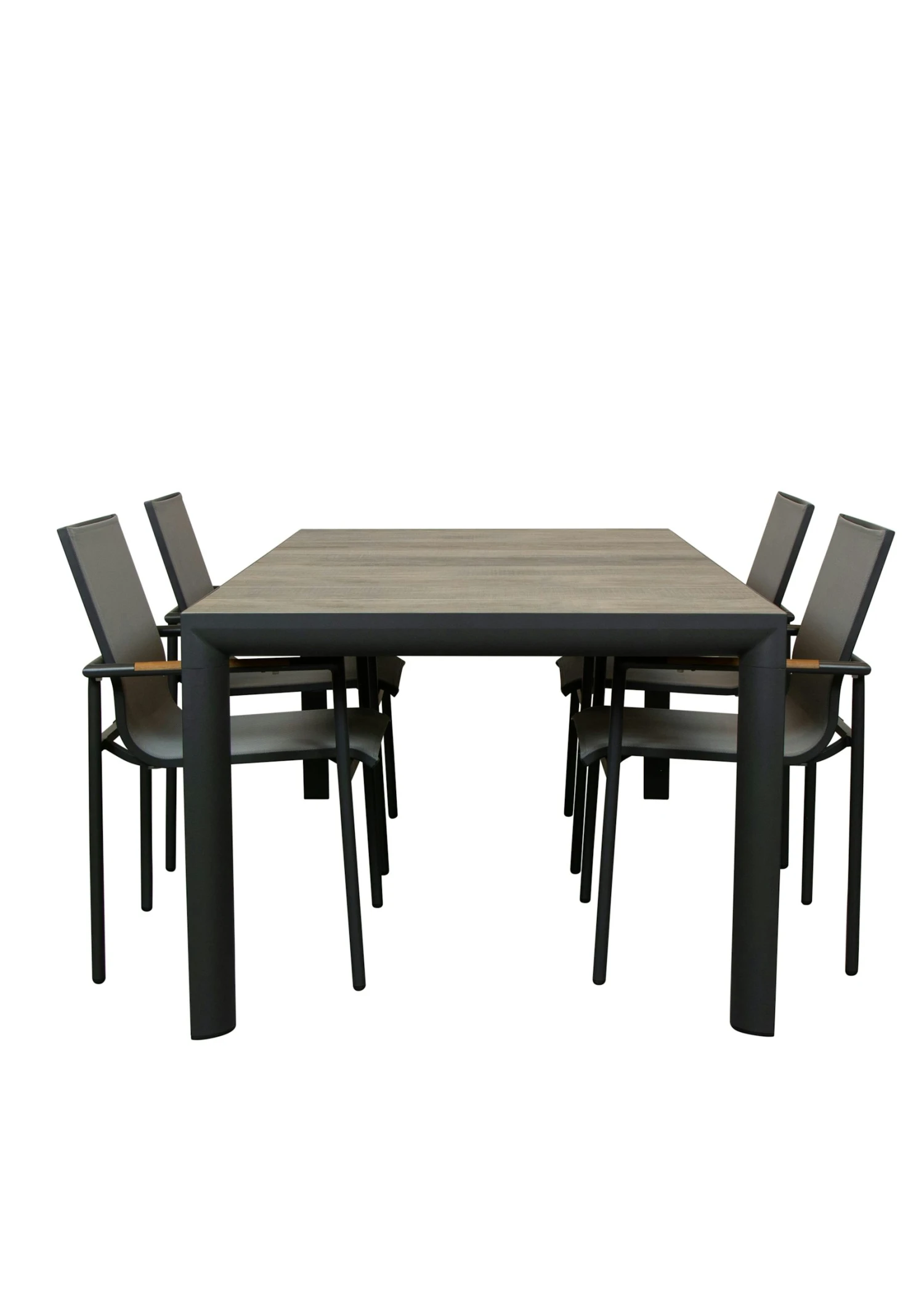 Deze prachtige stoel heeft een frame dat gemaakt is van aluminium en gepoedercoat in de kleur royal Grey. De zit en rug is gemaakt van textileen. Het texileen geeft een goede zit comfort. Door het textileen is het niet nodig om er een kussen in deze stoel te leggen. In de armleggers zit teak verwerkt. Dit geeft de stoel een warme afwerking. De Tulsi tuinstoel is daarom super mooi te combineren met een teak tafel omdat de teak terug komt in de stoel. De Tulsi tuinstoel is stapelbaar. U kunt de stoelen opstapelen en gemakkelijk opbergen.