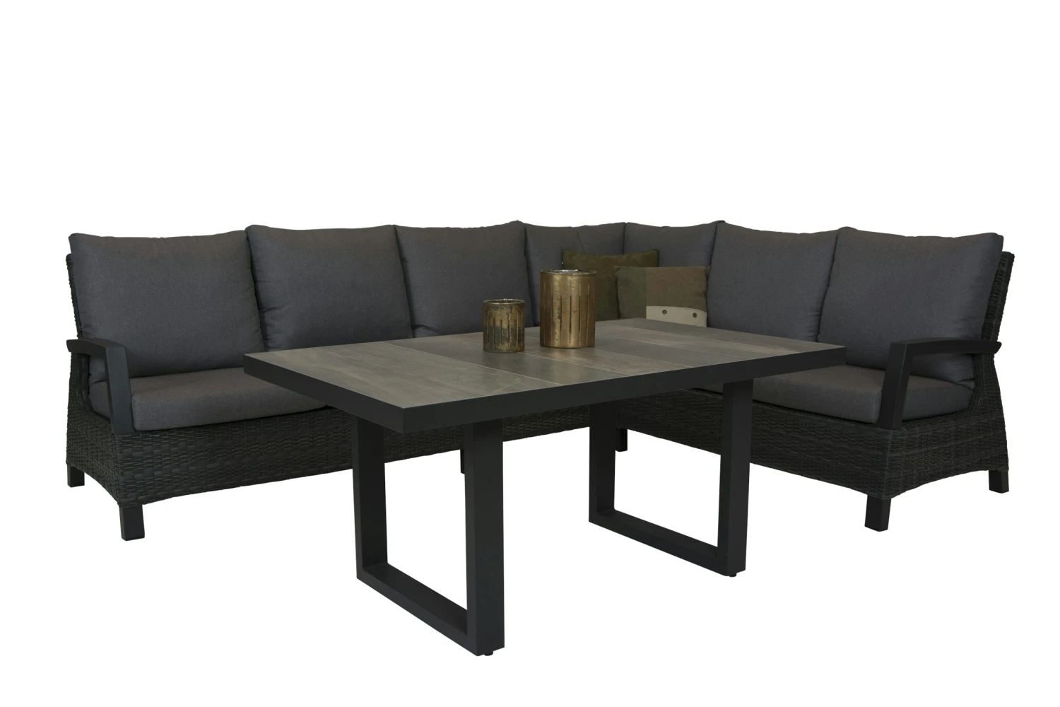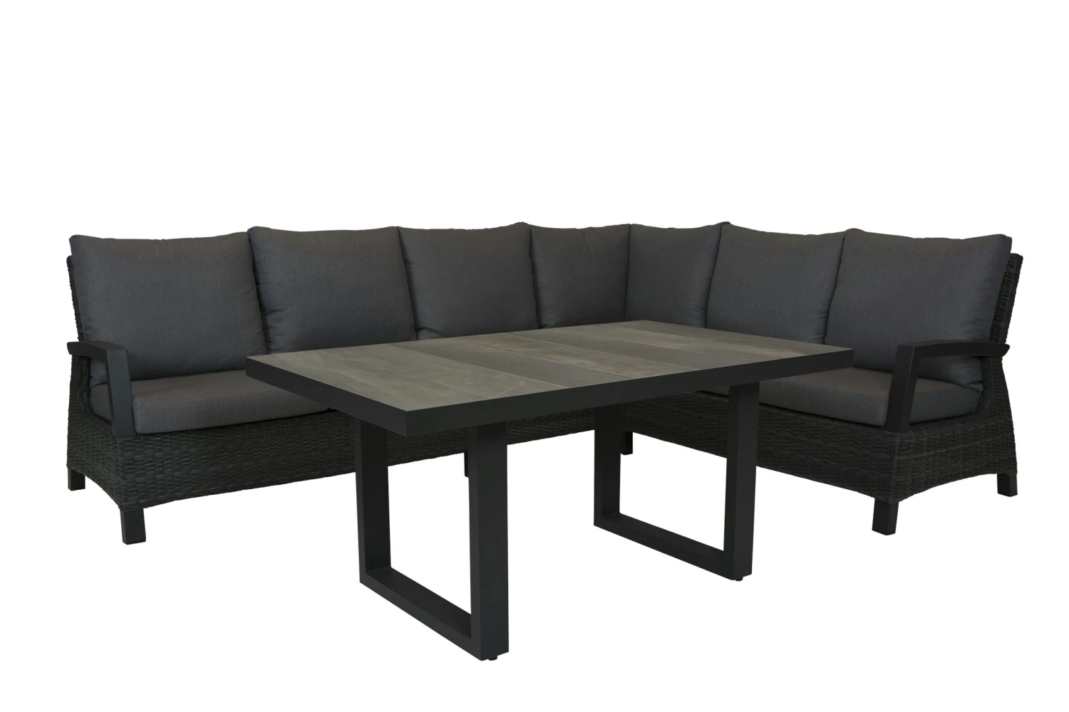 Deze mooie en strakke lounge hoek Darwin in de kleur Antraciet is helemaal de toekomst van lounge sets. Deze royale hoek Darwin is zowel links als rechts te plaatsen. Dit gaat eenvoudig omdat het losse elementen zijn. Door de combinatie van onderhoudsvriendelijke materialen en strakke lijnen past deze set bij alle stijlen. Het frame is van aluminium wat in de kleur Taupe is gepoederdcoat. Het vlechtwerk ook wel Wicker genoemd is van hoogwaardig kunststof. Deze is in een duo draad in de kleur Antraciet wat mooi bij het mat Antraciet aluminium frame past. De kussens van deze lounge set zijn van Olefin wat zeer kleur echt is en uitermate geschikt voor buiten en onder de overkapping.