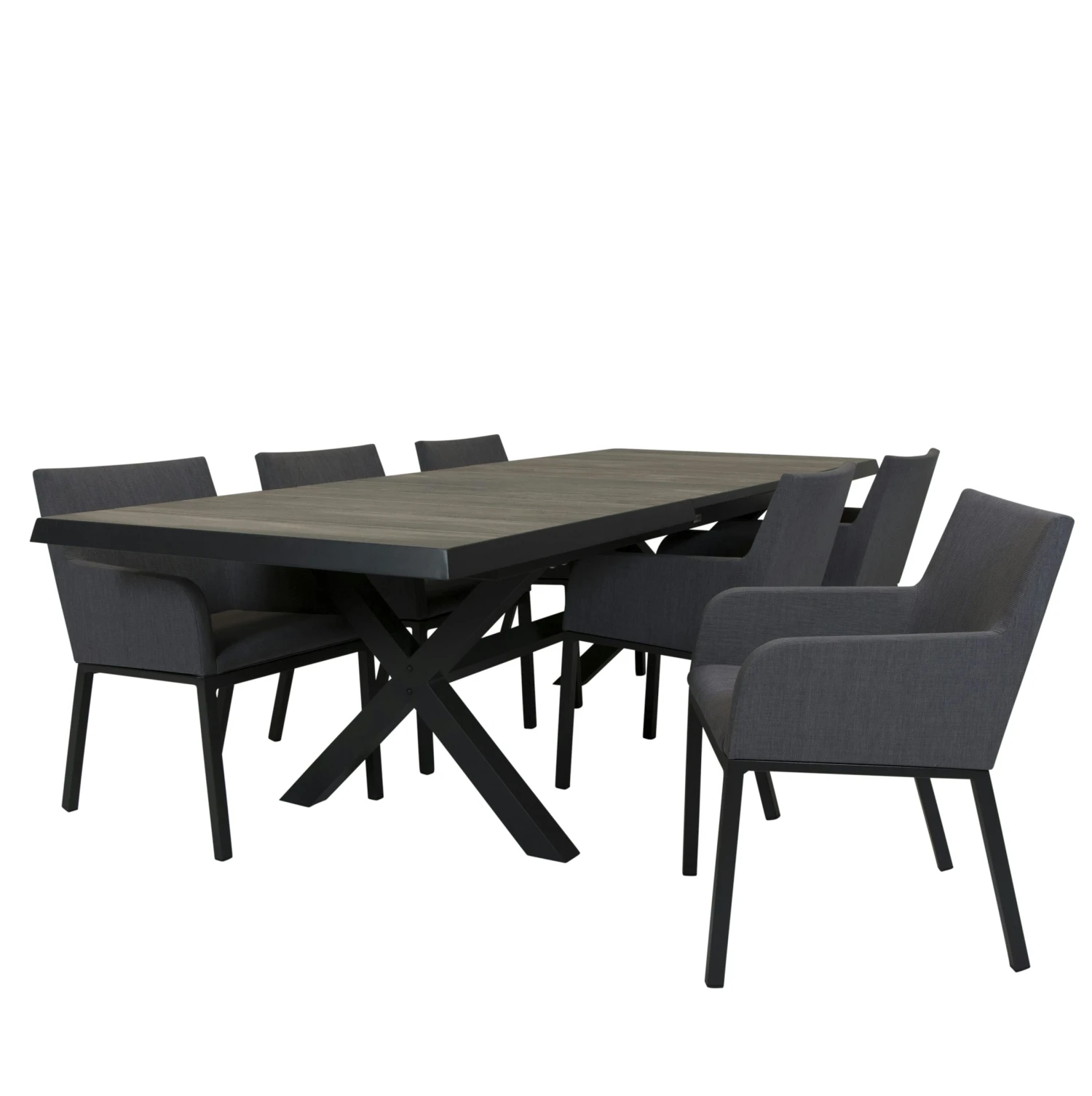 De Ottowa tuintafel is een zeer mooie en strakke uitschuif tuintafel. Door zijn mooie kruispoot en uniek uitschuif systeem. Je kunt de tuitafel met 1 persoon bedienen. Je kan de tafel in een hand omdraai uitschuiven naar 265 cm. Het frame is van onderhoudsvrij aluminium en is gepoeder coat in de kleur mat antraciet ook wel royal grey genoemd. Het blad is van keramische tegels. Deze tegels zijn zeer onderhoudsvriendelijk.