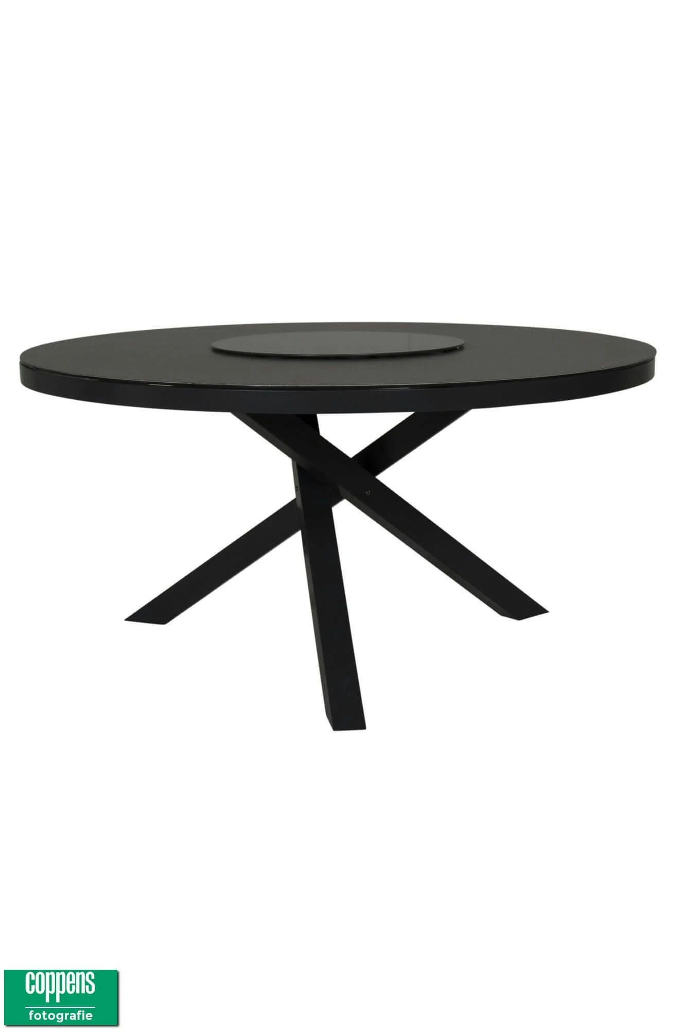 Deze moderne tafel heeft een aluminium onderstel wat antraciet gepoedercoat is. Door zijn strakke en moderne lijnen past deze tafel bij veel stijlen. Het blad is van 8 mm veiligheidsglas wat afgewerkt is met een porseleinen toplaag. Dat maakt de tafel zeer onderhoudsvriendelijk en krasbestendig. Doordat de tafel een doorsnede heeft van 150 cm kunt u er gemakkelijk 6 personen aan dineren. Het draaiplateau in de midden heeft een doorsnede van 60.5 cm. De hoogte van de tafel is 74cm.