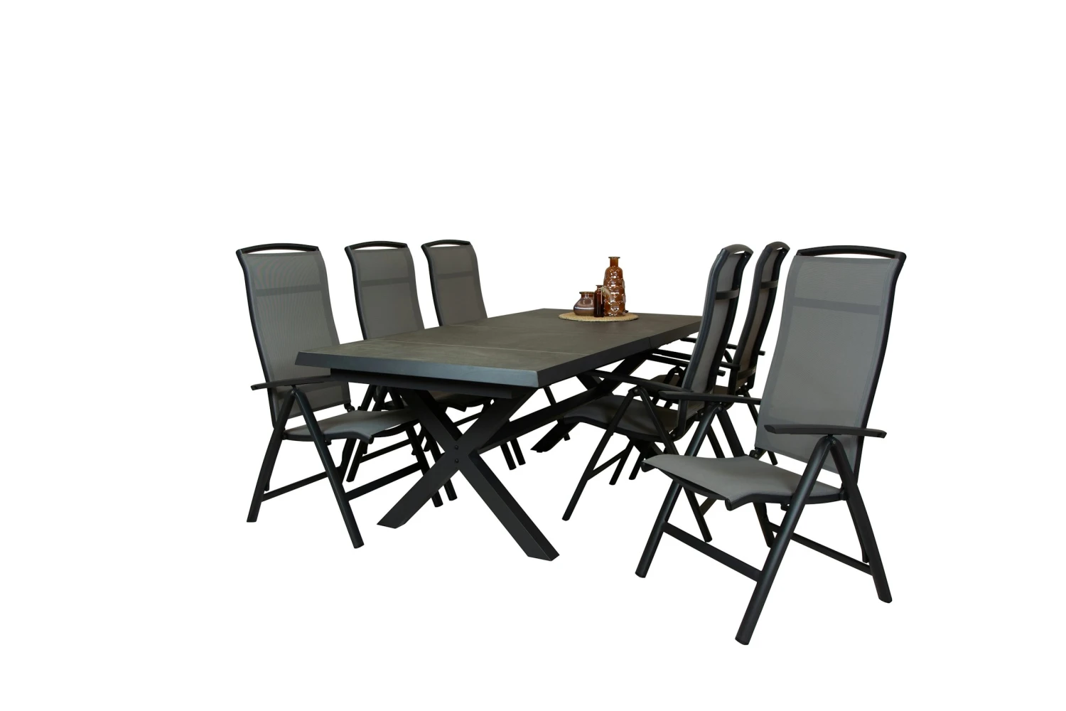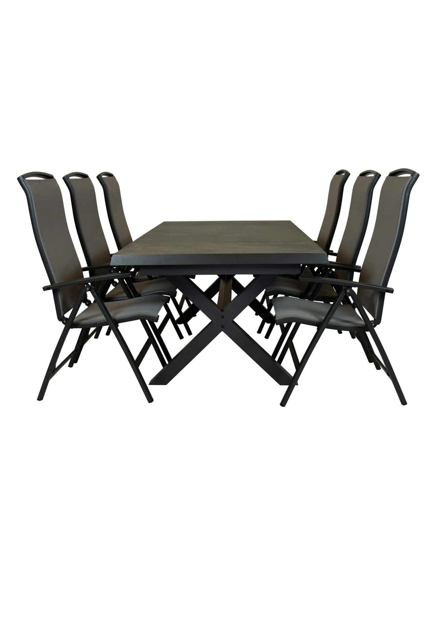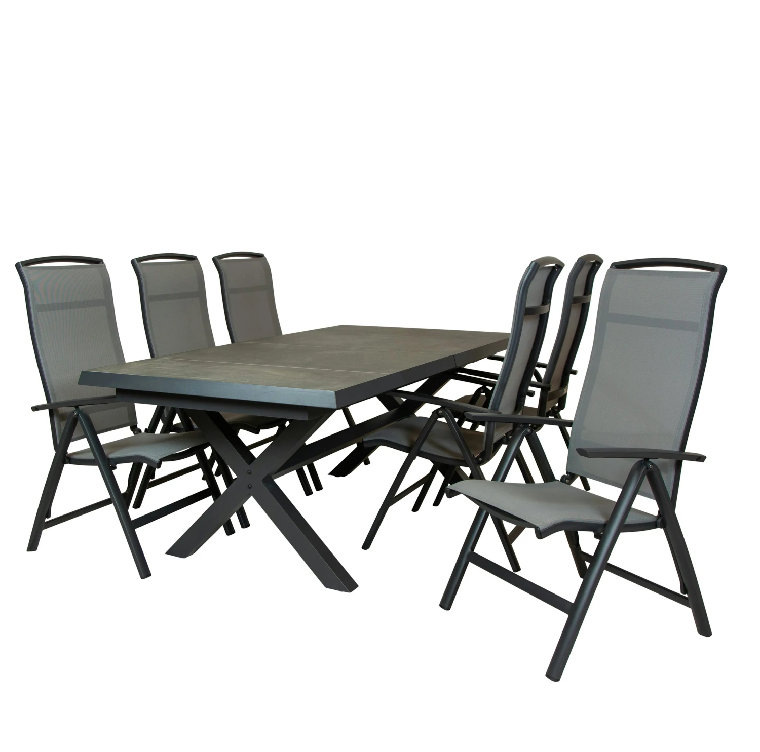 Deze zeer mooie uitschuiftafel Wicca is bijzonder door zijn mooie kruispoot en zijn uniek uitschuif systeem. De tafel kan door 1 persoon in een hand omdraai uitgeschoven worden naar 265 cm. Het frame is van onderhouds vriendelijk aluminium dat is gepoederd coat is in de kleur royal grey mat. het blad is van ceramische tegels antraciet die met zijn grijs makkelijk laat combineren.