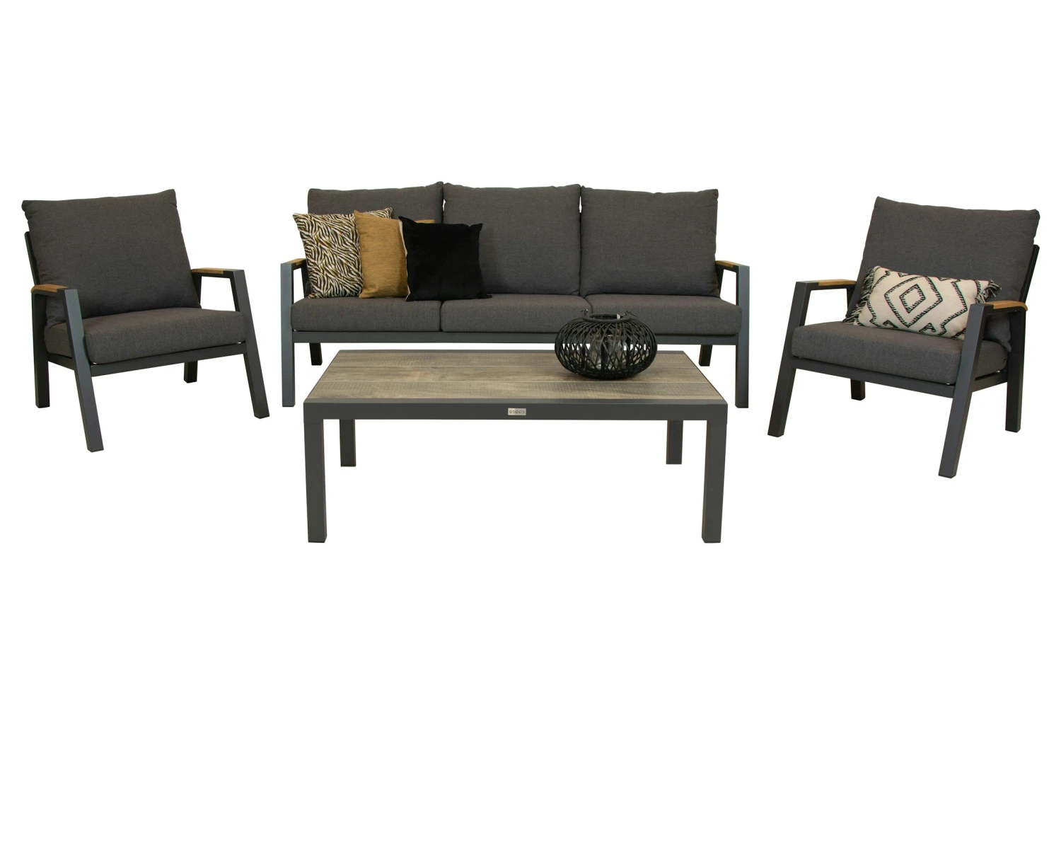 frame is onderhoud vriendelijk aluminium mat royal grey poeder coating. armlegger met teak afwerking