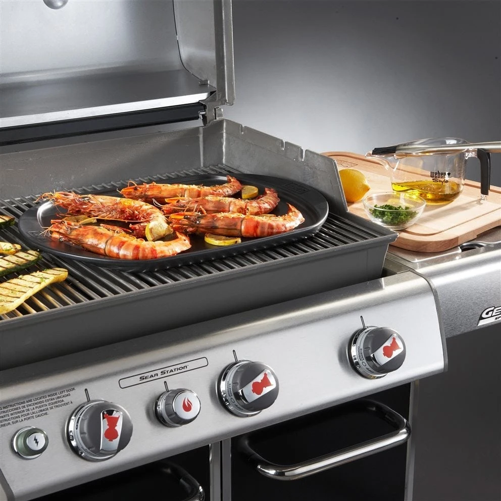 Maak u gereed voor quality time in de achtertuin. Met de vlakke bakplaat is het eenvoudig om een portie gehaktballen, garnalen, asperges of pannenkoeken op de barbecue te bereiden. Door de keramische antiaanbaklaag kan de bakplaat gloeiend heet worden en door de handgrepen is hij gemakkelijk op de barbecue te zetten en eraf te halen als hij koud is.
